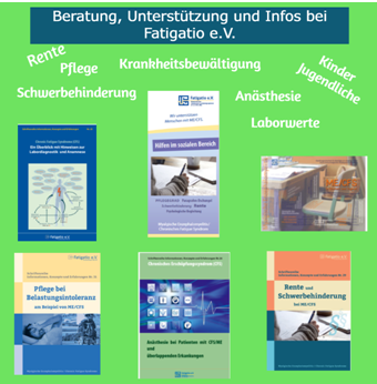 - www.fatigatio.de/me/cfs/... in Form von Informationsbroschüren für Kinder und Jugendliche wie auch für Erwachsene auch in Sachen Sozialrecht aber auch Schule und Bildung bwz. telefonisch vom Sozialteam Fatigatio