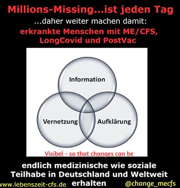 Die Deutsche Gesellschaft für ME/CFS e.V. - https://www.mecfs.de ist eine 2016 gegründete Organisation, die für die Rechte und Bedürfnisse von ME/CFS-Kranken eintritt. Dafür verbinden sie wichtige Expertise von Erkrankten und Angehörigen mit der Expertise eines erfahrenen Ärztlichen Beirats.