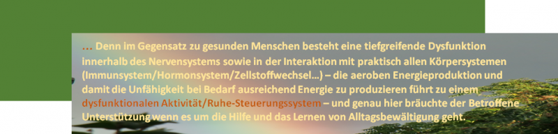 steht schon..."Denn im Gegensatz zu gesunden Menschen besteht eine tiefgreifende Dysfunktion innerhalb des Nervensystem sowie in der Interaktion mit praktisch allen Körpersystemen (Immunsystem, Hormonsystem, Zellstoffwechsel u.w.)..die aerobe Energieproduktion und damit die Unfähigkeit bei Bedarf ausreichend Energie zu produzieren führt zu einem dysfunktionalen Aktivitäts/Ruhe-Steuerungssytem."