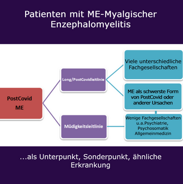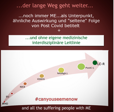 Nein…ME…hat noch immer keine eigene medizinische Leitlinie…sie kommt als "Unterpunkt" (Müdigkeitsleitlinie) – "seltene Form" (PostCovid Leitlinie) + und im Rahmen der LongCovid Richtlinie (der G-BA) als… "Erkrankung mit ähnlicher Ursache oder Krankheitsausprägung" vor. Bis ME eine eigene medizinische Leitlinie hat…findet der Patient keinen einheitlichen Behandlungs-oder Diagnostikpfad auf seinem Weg und in seiner Odysee in der medizinischen Welt.
