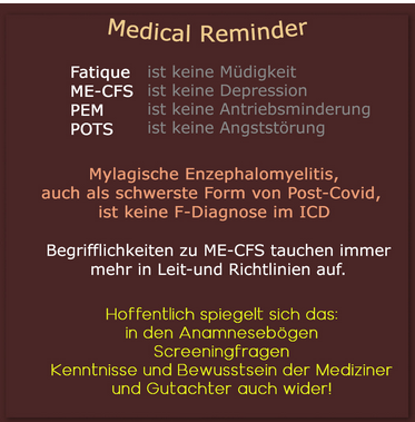 - Dass (theoretisch) keine aktivierenden Therapien mehr angeboten werden dürfen bei ME/CFS oder Verdacht auf ME/CFS.