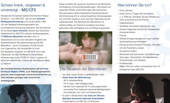 Solange das öffentliche Gesundheitswesen und die Politik keine adäquate Informationen und Aufklärungsbroschüren zu ME-CFS-PostCovid verbreiten für Betroffene, ihre Familien und Angehörigen, die Pflegenden, die Behörden, die Ärzte - müssen dies die Erkrankte und ihre Patienteninitiativen selbst tun.