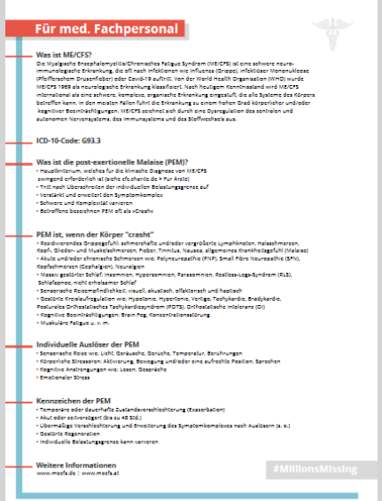 https://www.mecfs.de/presse/pressefotos - Die Organisation MillionsMissing Deutschland - hat unterschiedliche Infoblätter für med. Fachpersonal sowie Interessierte