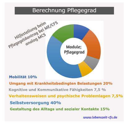 - Die Pflegemodule beziehen sich leider (immer noch) teilweise auf Demenz oder auf körperliche Beeinträchtigungen die mit Hilfe und Unterstützung teilweise behoben werden können. Dies ist bei der schweren neuroimmunologischen Erkrankung mit Belastungsintoleranz bzw.Postexertioneller Malaise aber oft gar nicht mehr möglich ohne eine massive Zustandsverschlechterung zu riskieren.