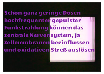 Denn schon ganz geringe Dosen hochfrequenter gepulster Funkstrahlung können das zentrale Nervensystem, die Zellmembranen beeinflussen und toxischen Stress mit unterschiedlichen Folgen auslösen!