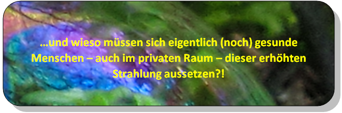- Menschen die sich damit kritisch auseinandersetzen werden nach wie vor als überempfindlich (im Krankheitsfall sogar psychiatrisiert) oder gegen den Fortschritt gewendet charakterisiert. Jedoch Fortschritt kann ja auch bedeuten weiter Technologien zu entwickeln die weniger schädlich sind und das Selbstbestimmungsrecht der Bürger über seine Daten und seine Strahlenbelastung nicht weiter einzuschränken!